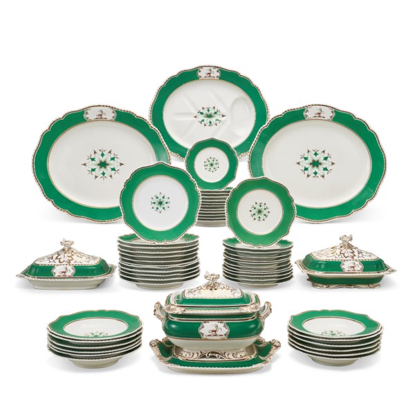 A tureen, cover and stand-- 143⁄4 in. (37.5 cm.) wide, the stand A rectangular well-and-tree serving dish and cover-- 113⁄4 in. (29.8 cm.) wide; the dish with a small (approx. 1⁄4 in. diameter) chip to one corner and restored section (approx. 2 in. long) to the footrim, the restoration somewhat yellowed A footed vegetable dish and cover-- 113⁄4 in. (29.8 cm.) wide; the finial at the cover restuck and secured with a metal pin, the upper end of the pin visible atop the finial and the lower end drilled through the red script mark; the body with one corner previously off and in two pieces, now reattached with six sets of filled previous staple-repair holes to the underside (not visible from the front); a stained hairline across the base (approx. 6 in. long), the hairlines also with three sets of filled previous staple-repair holes, one set visible from the front Two oval platters-- 203⁄8 in. (51.8 cm.) long; a shallow chip (approx. 3⁄8 in. long) to the underside of the rim at the 7:30 position An oval well-and-tree platter-- 181⁄4 in. (46.4 cm.) long Twelve dinner plates-- 10 in. (25.4 cm.) diameter; two of the plates slightly smaller and with a slightly darker green ground Twelve luncheon plates-- 91⁄8 in. (23.2 cm.) diameter; one plate with a small chip, slightly darkened, at the underside of its rim; one with a chip (approx. 1⁄2 in. long) to one of the points at its rim; two plates each slightly smaller and with a slightly darker green ground Twelve bread plates-- 73⁄4 in. (19.7 cm.) diameter; one plate with a shallow, darker chip (approx. 3⁄8 in. long) to its rim Twelve soup plates-- 103⁄8 in. (26.4 cm.) diameter; one plate with a shallow, darker chip (approx. 1⁄4 in. long) to its rim; 2 plates each with a hairline crack in from the rim across the border, and another plate with two hairlines in from the rim (the longest hairline approx. 3 in.)