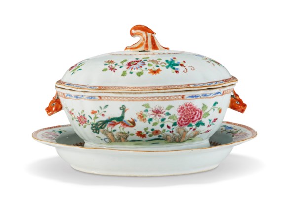 QIANLONG PERIOD, CIRCA 1750A CHINESE EXPORT SHAPED-OVAL 'DOUBLE PEACOCK' TUREEN, COVER AND STANDEstimate: USD 7,000 - 10,000