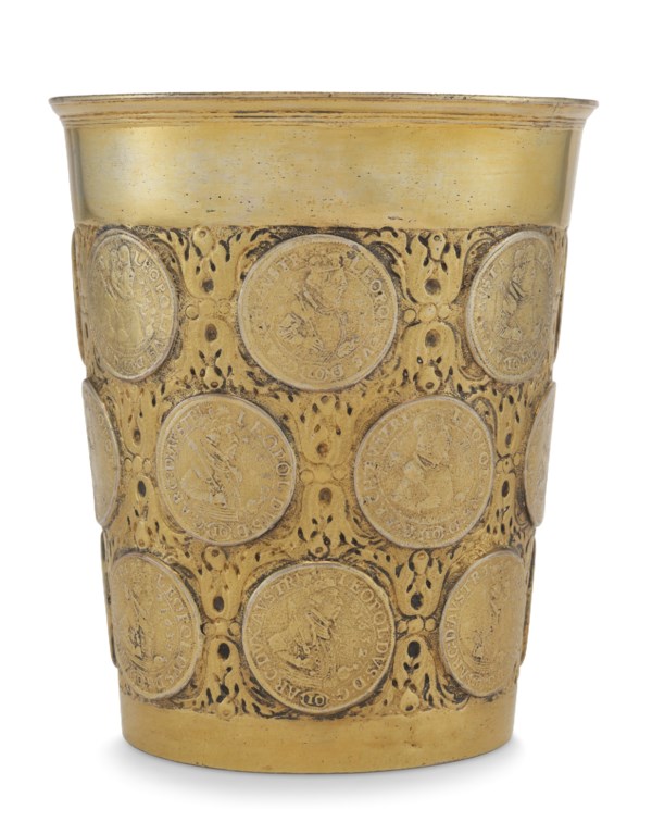 This beaker is set with twenty-one Austrian 10 Kreuzer coins depicting Archduke Leopold V and variously dated between 1627 and 1632 to the sides, while the base is set with a German Taler coin depicting Johann Georg III of Saxony.