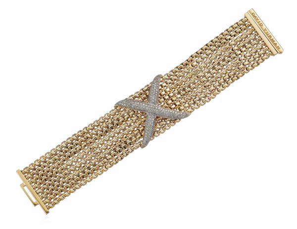 Designed as 8 rows of gold links centering on a diamond-set 'X'