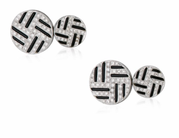 Diamonds are bright and lively One onyx plaque has minor chips These Onyx and diamond cufflinks are overall in very good condition