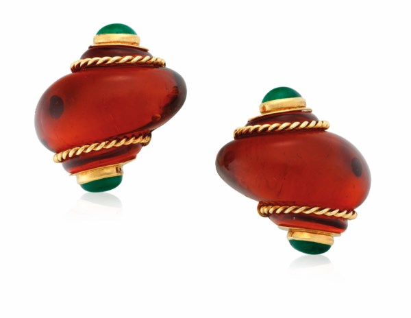 Clip backs for non-pierced ears Emeralds with typical inclusions, some eye visible and surface reaching Carved resin with minor pits visible under magnification Gold with typical signs of wear