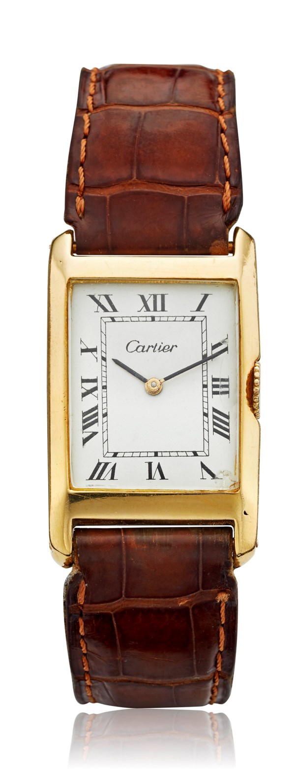 The case has scratches. The case has a hole near the bottom right lug. The case has developed patina. The case has been polished. The hallmarks are polished. Based on the service papers, the dial was re-finished by Cartier in 1997. The hands have developed patina. The crystal is chipped in the bottom right corner. The crystal is chipped near 3 o'clock The 18k gold buckle is in good condition and is signed "Cartier." The movement is in working order at the time of cataloging, consistent with the age of the watch. The movement has not been tested for accuracy. A service is recommended given the age of the watch.