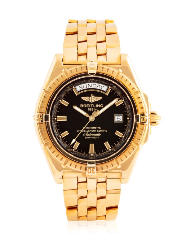 Movement: Ticking at time of cataloguing, however a service is recommended. The date advances when the hands pass midnight or through the crown. Case: With very minor surface scratches mainly to the case back, very minor signs of oxidation to the bezel. Bracelet: 18k gold Breitling bracelet with deployant clasp with minor surface scratches and overall length approximately 180 mm. Overall Condition: Very good.