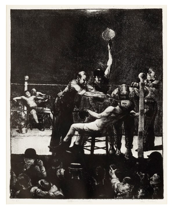 Between Rounds depicts a challenge match between the former lightweight champion Jimmy Nolan and his sparring partner Tornado Black. Black had not only usurped Nolan's title, but also his wife. While Black was favored going into the match, "It was rumored that Nolan had lost his punch, but as he was about to be knocked out, he used his 'last ounce' of strength to win the fight" ("Bellows: The Boxing Drawings," in Bellows: The Boxing Pictures, p. 53). Like the same titled drawing from 1912, this lithograph depicts the ring during a rest period. The focus is on Nolan, who is perceptibly fatigued and leans against the ropes as his three handlers attend to the soon to be champion, giving him water, fanning him and providing a closely whispered pep talk. Across the ring, the reigning champion, Black rests, equally exhausted against the ropes, receiving his own whispered fighting words. Bellows powerful use of light and shadow conveys the tension and heat of the scene, and while the fighters rest, his dynamic depiction of the crowd details the other side of a boxing match, the audience's involvement.