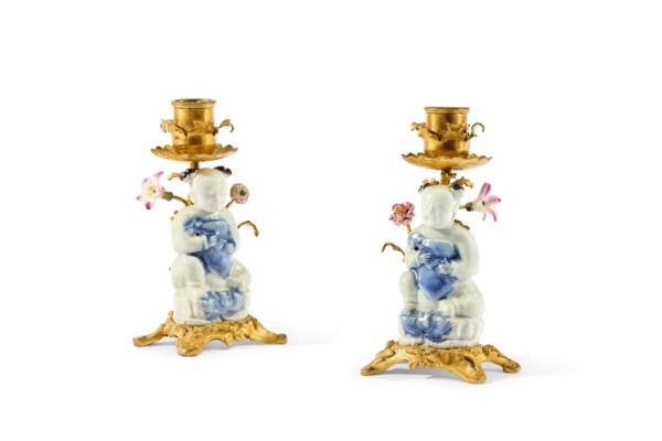 Good overall condition. The illustrations published on the website catalogue are accurate. There are the inevitable minor dents, marks, scratches and rubbing consistent with age and use. Gilding: with signs of tarnishing and minor casting flaws. The branch of one is slightly wobbly. Chinese porcelain : Viewed without dismantling the bronzes. There is a crack at the top and on the left side of the head. There are few losses of glaze around the left hair bun. European porcelain: flowers are later.
