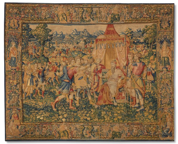 Une version plus ancienne vendue chez Christie’s New-York le 22 novembre 1980, lot 276, illustre parfaitement l’esthétique de la Renaissance, avec des personnages vêtus à l’Antique inscrits dans une architecture classique. Elle faisait partie d’une série réalisée par Guillaume de Pannemaker, achetée par Philippe II en 1550. Une autre tapisserie conservée au Kunsthistorisches Museum de Vienne, tissée vers 1560 par François Geubels, probablement le père de Jacques Ier Geubels (G. Delmarcel, La Tapisserie flamande du XVe au XVIIIe siècle, Belgique, 1999, p. 159, fig. 5.5.), présente une composition très proche de notre tapisserie. La bordure arbore une ornementation de vases fleuris posés entre des cariatides sur les bords latéraux avec un animal au centre, et surmontés de proverbes latins. Elle est ornée en bas d’un médaillon illustrant un des douze travaux d’Hercule, thème représenté également sur la bordure de notre tapisserie sous la forme de deux scénettes identiques en haut et en bas. Enfin, une tapisserie conservée à San Francisco réalisée vers 1625 par Jacques Geubels II (1599- vers 1630), fils de Jacques Ier, en collaboration avec Jan Raes (vers 1545), illustre le même thème de manière quasiment identique (Fine Arts Museum of San Francisco, inv. 3755). Les personnages sont répartis en frise sur une perspective dégagée ouvrant sur un paysage montagneux et une bataille. La bordure est quant à elle richement décorée de guirlandes de fruits et légumes.