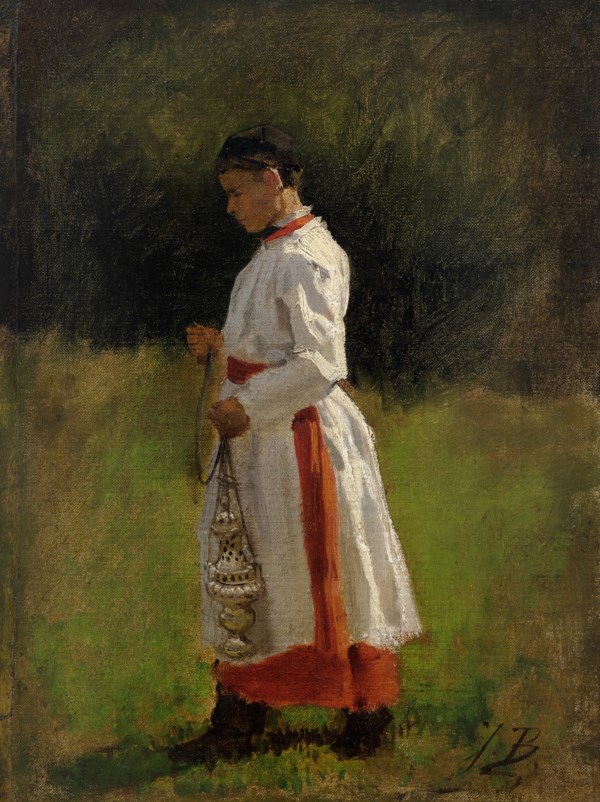 Jules Breton’s first official recognition as an artist came in 1855 for The Gleaners. Further awards followed for The Blessing of the Wheat in Artois (Musée des Beaux-Arts, Arras) in 1857 which earned him a silver medal at the Salon and was purchased by the French State (fig. 1). The present painting is a sketch for the figure of the altar boy holding the censer in the center of the painting.
