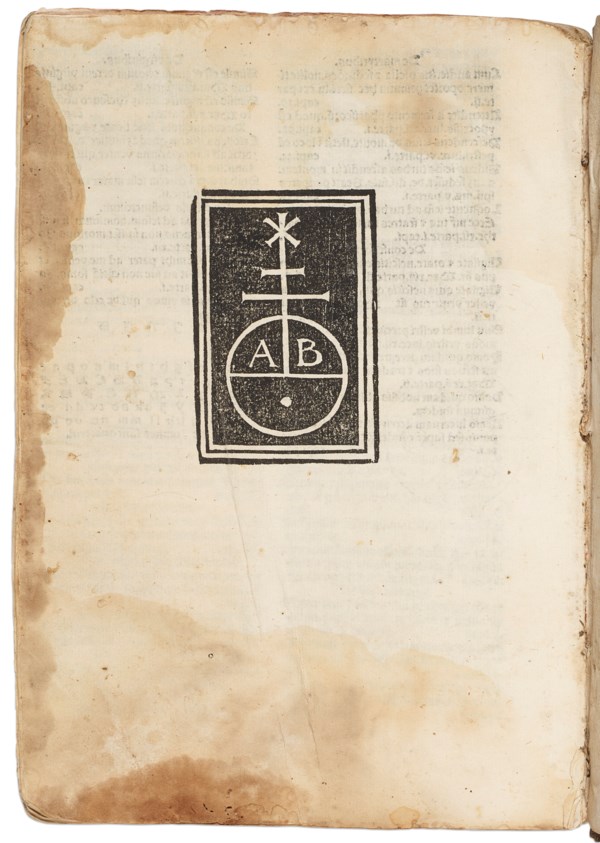 Chancery quarto (165 x 118mm). 542 leaves (of 544, lacking leaf ss8 and final blank). Woodcut printer's device at end (title damaged with half replaced in facsimile, first gathering loose, dampstaining and worming throughout). Early blindstamped calf over flexible boards (binding very deteriorated, with boards splitting to reveal printed waste within and losses to upper board and spine, some threads renewed). Provenance: marginalia, wayfinding labels, and underlining throughout, often trimmed – remains of two early ownership inscriptions on damaged title – faded stamp on top edge, old library label.