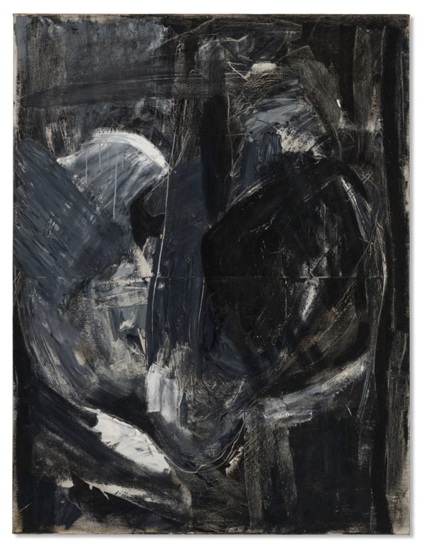 This work has not been examined unframed. The canvas is slightly slack and slight soiling is occasional. A stretcher bar impression is to center. Minor wear and rubbing is to the corner-tips and turning edges and fine hairline tension cracking is to the upper left turning edge. A linear abrasion is to the lower left corner in a dark gray painted passage and a pinpoint puncture is to the upper left quadrant in a gray painted passage. Hairline cracks are scattered, some with slight yet stable lifting, and drying cracks are intermittent to the black painted passages. A few losses are scattered and pinpoint accretions are occasional. There is no apparent inpainting visible under ultraviolet light.