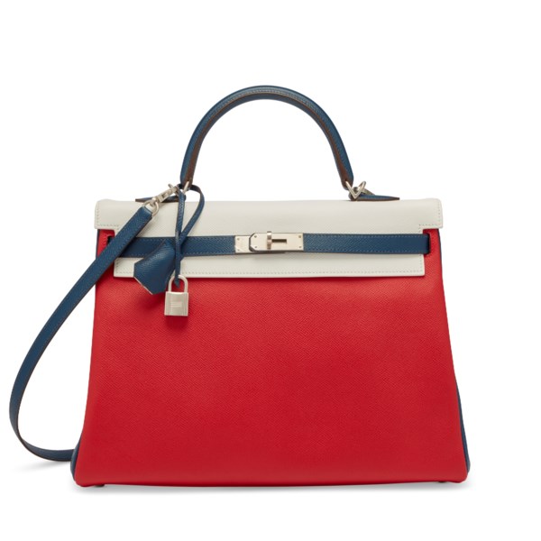 A CUSTOM WHITE, ROUGE CASAQUE & BLEU MARINE EPSOM LEATHER RETOURNÉ KELLY 35 WITH BRUSHED PALLADIUM HARDWARE