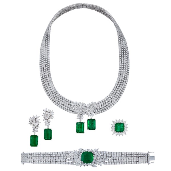 THIS MARCONI EMERALD AND DIAMOND NECKLACE, BRACELET, EARRING AND RING SUITE WITH GÜBELIN AND GIA REPORTS IS AS NEW.