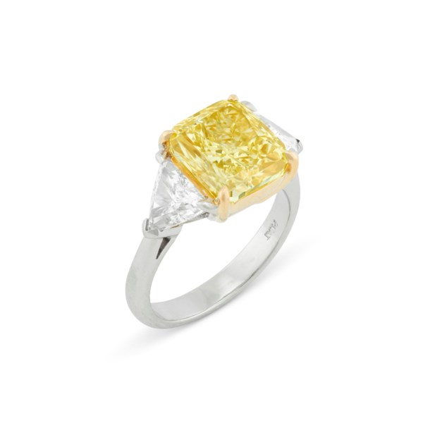 -Overall condition: good. Shows normal signs of wear, including abrasion marks and small indentations to the metal. -Additional marks: PLAT, Pt950, 750. -Coloured diamond: 5.39 carats (GIA). -Diamonds: bright and lively.