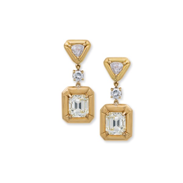 -Diamonds: rectangular-shaped on average K to M and M+ colour, VVS to VS clarity. One diamond with an inclusion visible under the crown, close to the girdle; the remaining diamonds G to H colour, VS clarity. Colour has been gauged as far as the yellow mounting permits.