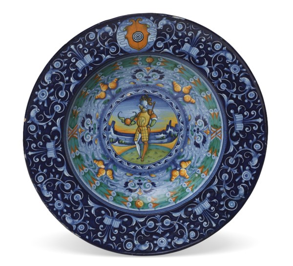 When Otto von Falke published this piece in 1912, he attributed it to the Casa Pirota workshop, as it was thought that blue or berettino ground borders with grotesques were made there, but this has subsequently been disputed, and this type of decoration is now associated with the workshop of Piero (or Pietro) and Paolo Bergantini, one of the principal maiolica workshops in Faenza in the first half of the 16th century (A.V.B. Norman, ‘A note on the So-called Casa Pirota Mark’, Burlington Magazine, III, 1969, pp. 447-448, and J.V.G. Mallet, ‘Maiolica at Polesden Lacey’, Part 1, Apollo Magazine, No. 92, 1970, p. 264). The only piece marked as being made in the Bergantini workshop which is known to have survived also has a berettino-ground border with grotesques (A bowl decorated with Marcus Curtius, which bears the inscription ‘made in Faenza in the workshop of Maestro Piero Bergantini, 17 June 1529’, see Carmen Ravanelli Guidotti, Thesaurus di opera della tradizione di Faenza, Faenza, 1998, pp. 351-355).